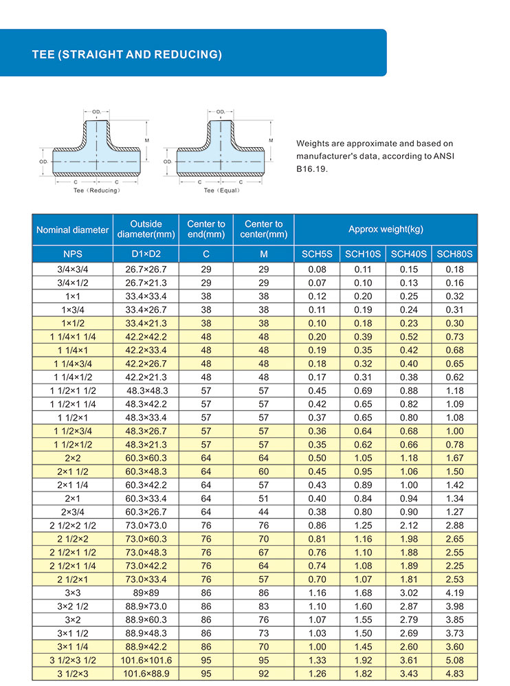 Stainless steel tee is the piece that connects fittings and pipes. Stainless steel tee can be divided into two types. One is equal tee, the other is reducing tee. Equal tee has the same dimension of ends. Reducing tee has the same dimension of the main pipe, while the dimension of branches is smaller than the main one.